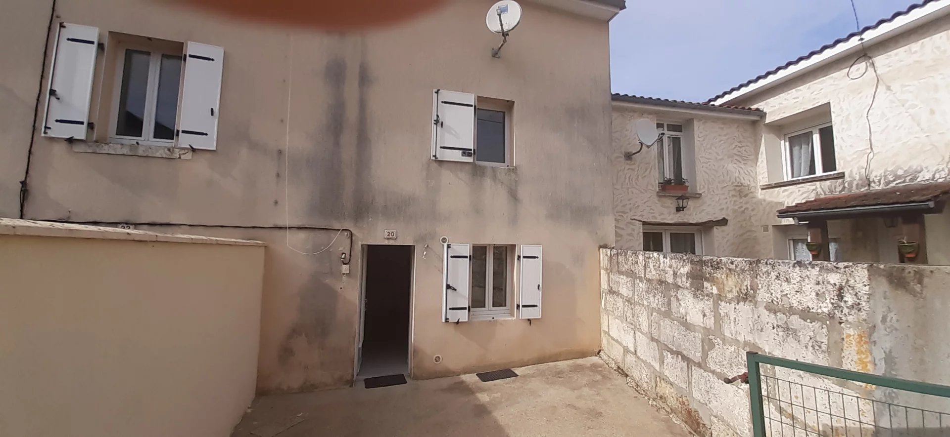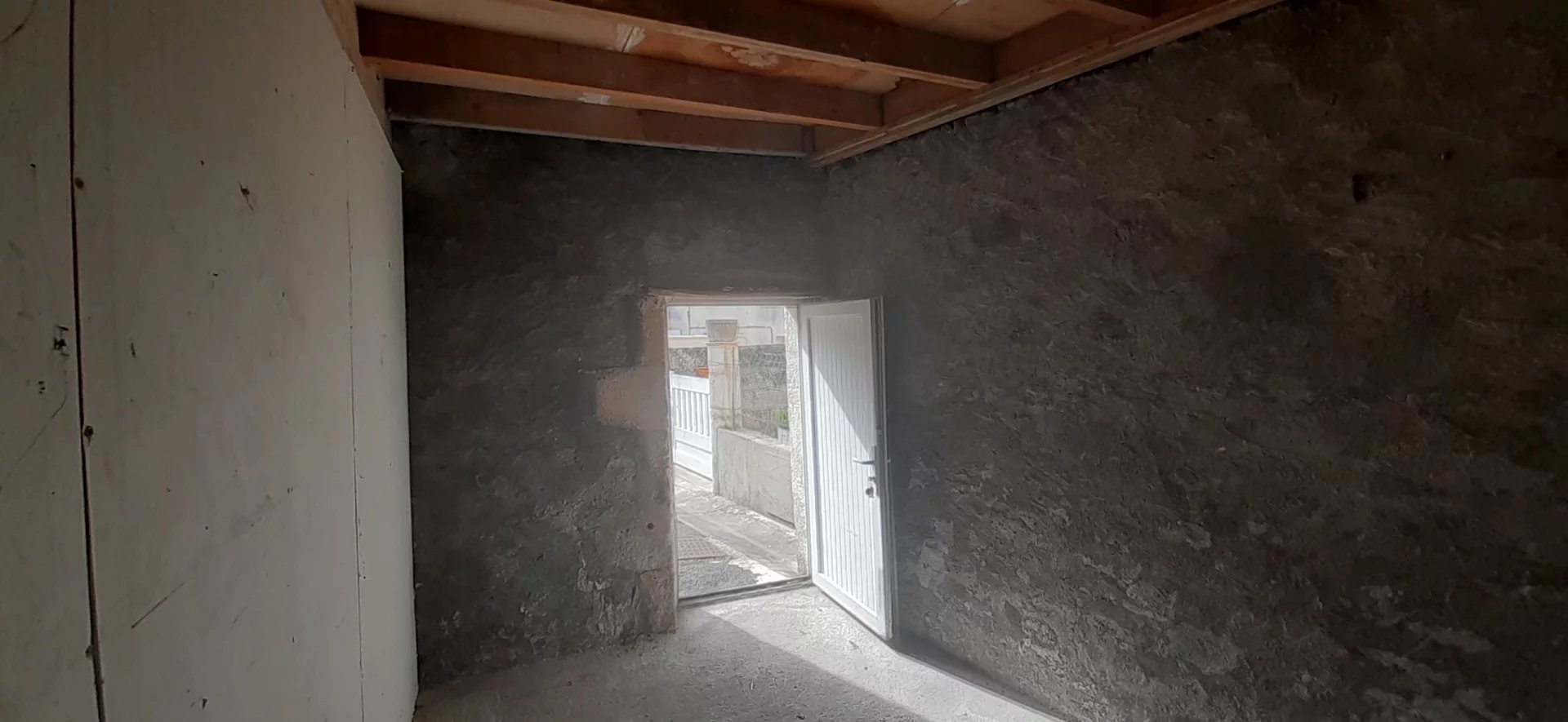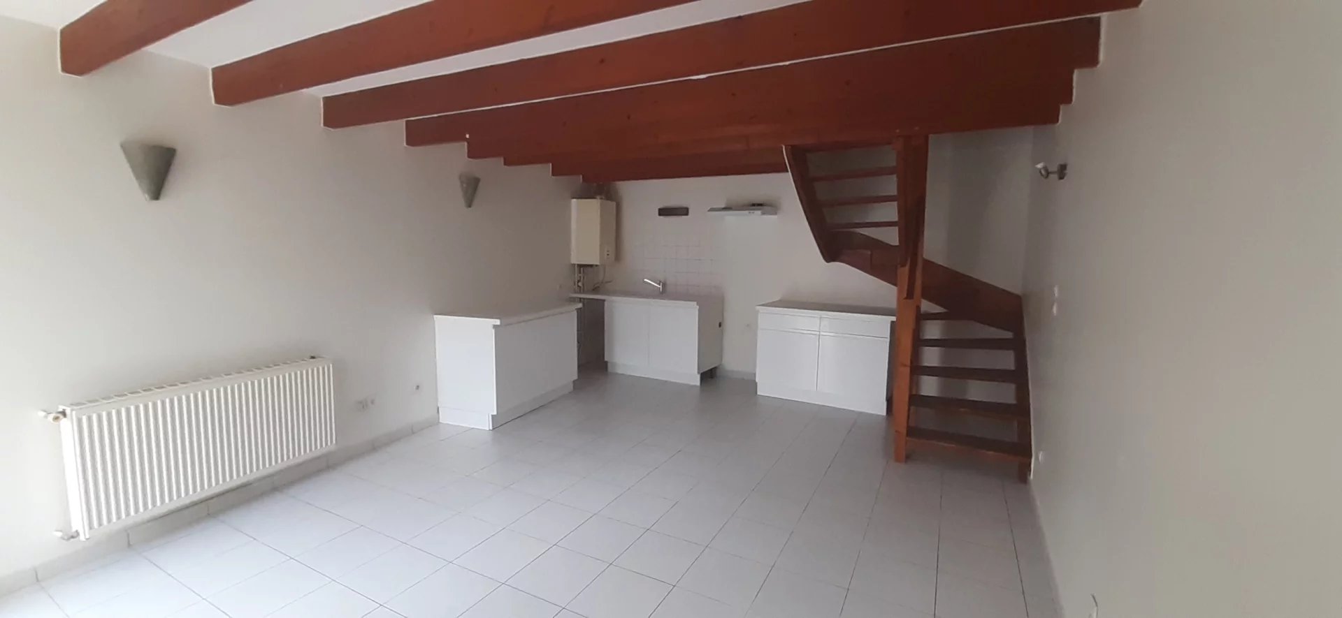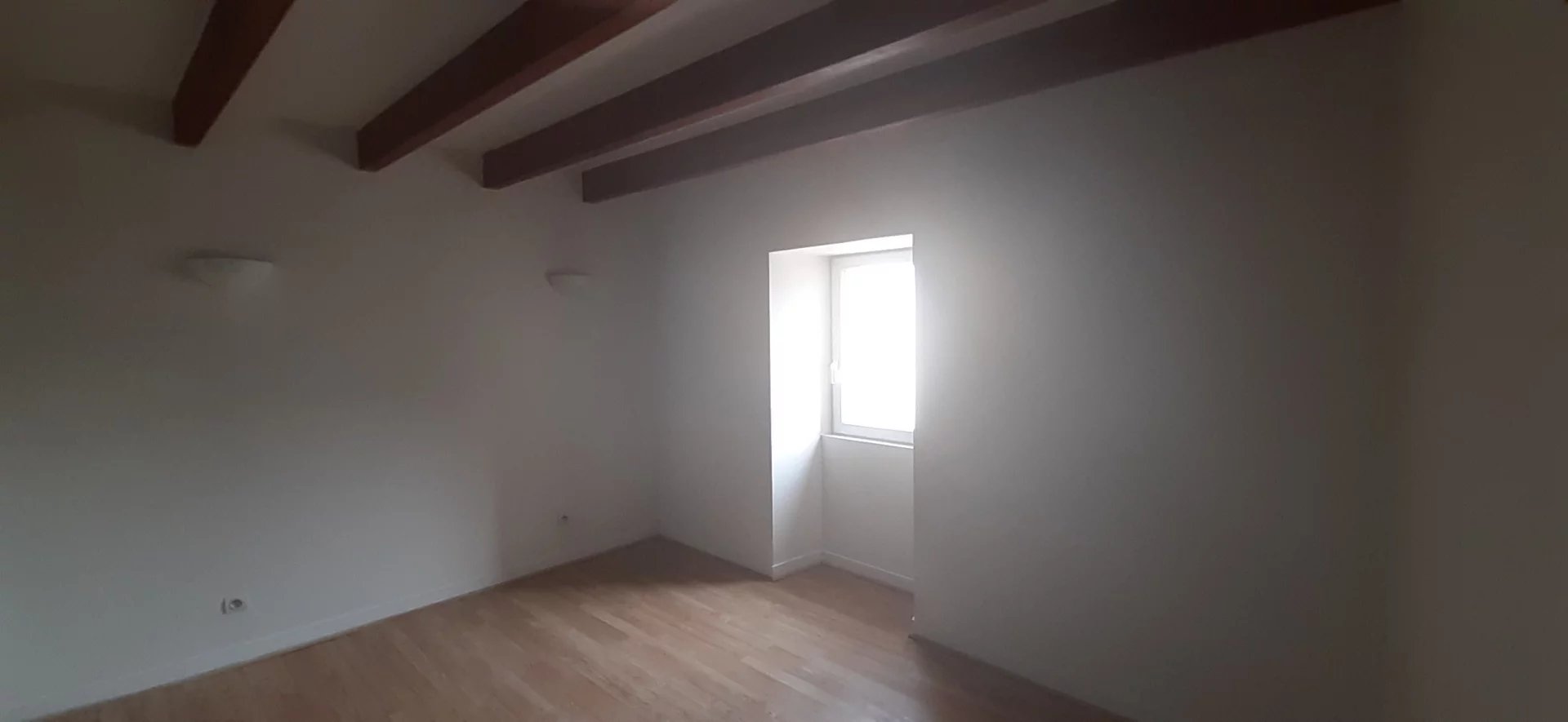 Maison de bourg Rénovée type 3 (62 m²) avec cour en façade. Séjour avec coin cuisine aménagée, 2 chambres, salle de bains et wc, cellier. Chauffage gaz. EAU COMPRISE.